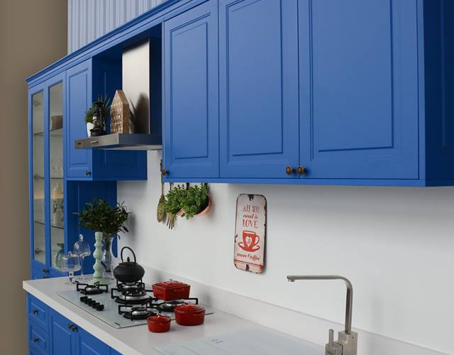 Com proporções e linhas clássicas, essa cozinha se torna contemporânea na aplicação de acabamento em laca fosca da Perfar Móveis e na escolha do azul vibrante. A cristaleira com vidro nas portas traz leveza e remete ao brilho da bancada em Silestone by Cosentino branco.